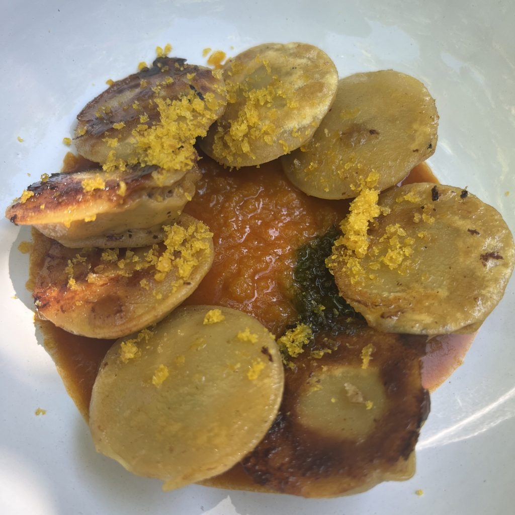 Il percorso enogastronomico ruota intorno ad una degustazione di 4 portate con entrée vegetale di benvenuto con ode al pomodoro, Bottone di cacciatora di Muggine, ristretto di livornese, basilico, bottarga, Rana Pescatrice alla brace laccata, salvia, rosmarino, Lampone e zafferano, soffice allo zafferano e cioccolato bianco, gelato ai lamponi. Il tutto annaffiato dagli ottimi vini a cura di Matteo Mazza.