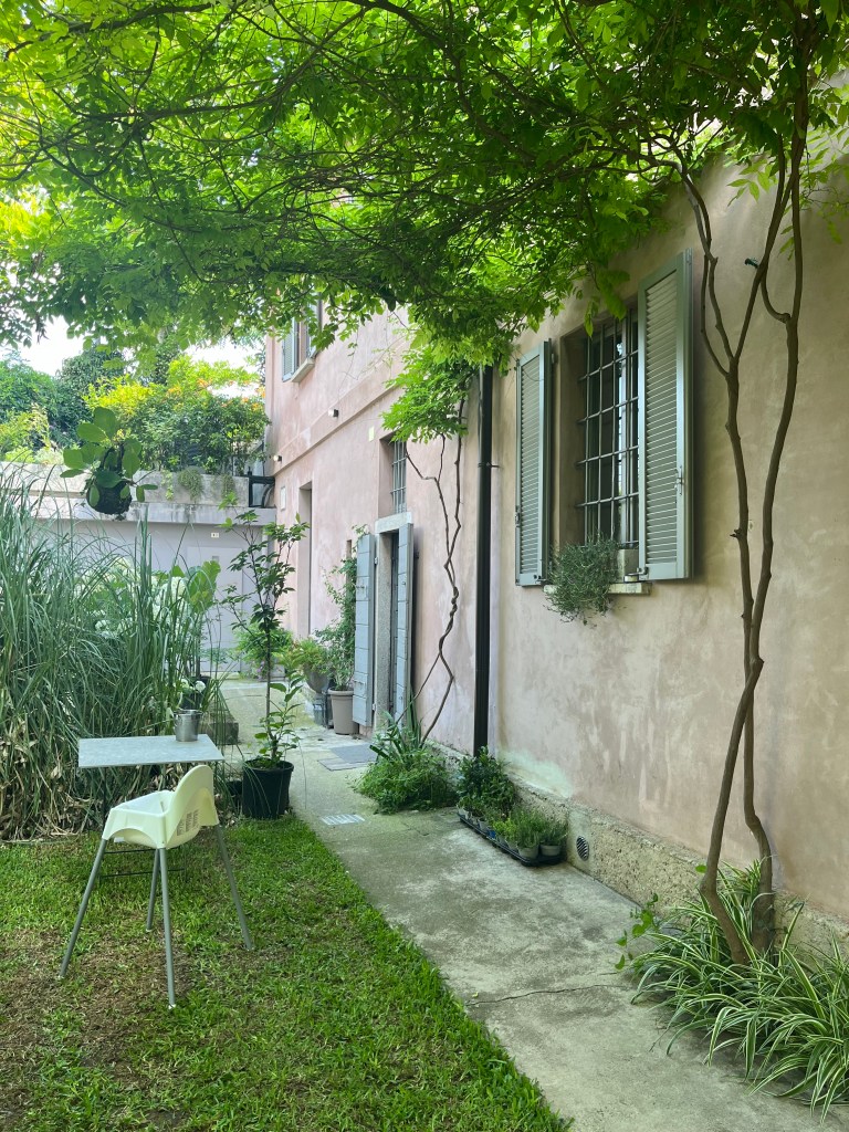 Un grande glicine ancora fiorito, kokedamas a impreziosire il pergolato, un orto di erbe aromatiche che sovrasta il giardino, alberi da frutto, una piccola “foresta di bambù”, una parte adibita a Galleria d’arte e le libellule del Naviglio che sovente arrivano a far visita. Un contesto che inebria l’animo e lo spirito e riporta l’ospite al contatto con la natura, uno spazio di fuga dalla città.