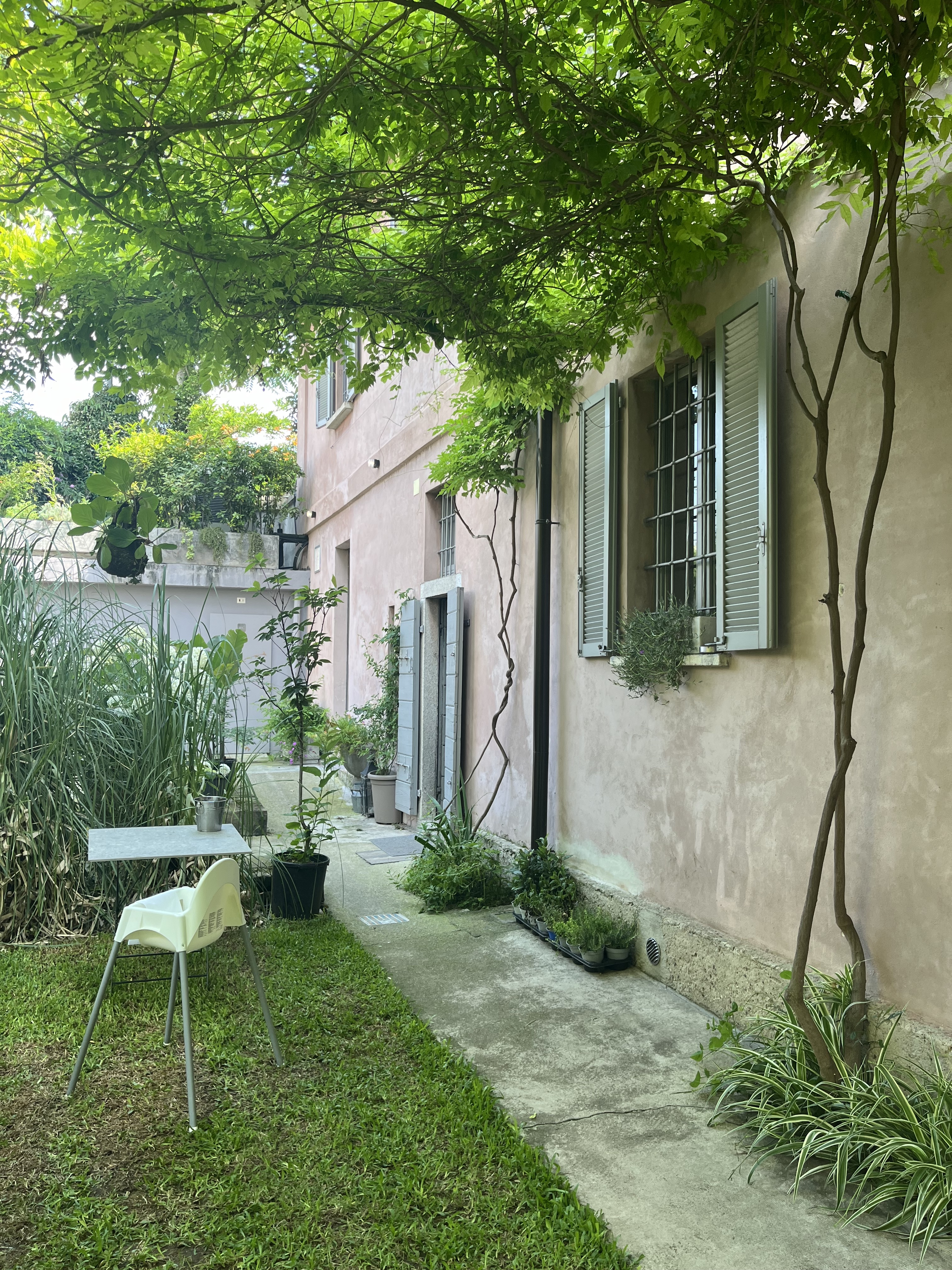 Un grande glicine ancora fiorito, kokedamas a impreziosire il pergolato, un orto di erbe aromatiche che sovrasta il giardino, alberi da frutto, una piccola “foresta di bambù”, una parte adibita a Galleria d’arte e le libellule del Naviglio che sovente arrivano a far visita. Un contesto che inebria l’animo e lo spirito e riporta l’ospite al contatto con la natura, uno spazio di fuga dalla città.